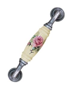 櫥櫃把手 抽屜把手 鄉村風玫瑰花 雙孔 直式 米色 孔距 128mm 陶瓷把手- 古銀色座 HG820SKMI